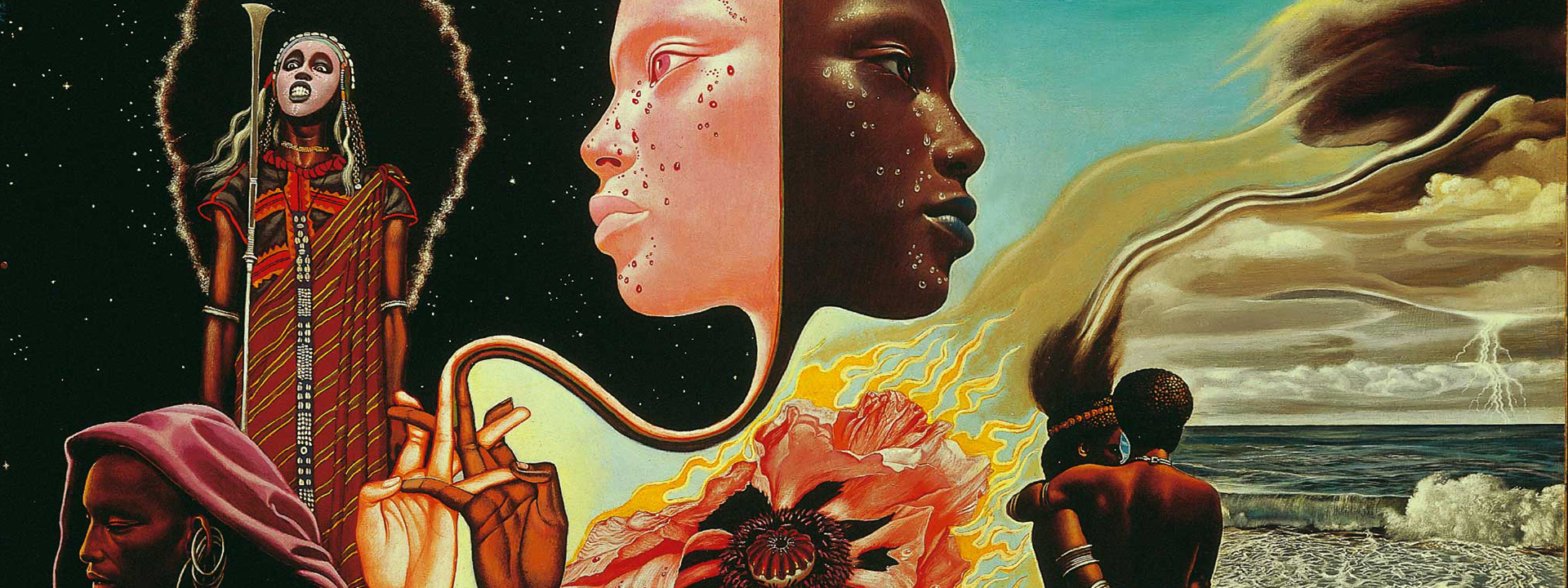 E como cena que parece ser central e que foi selecionada na dobra da capa para ser a parte frontal, uma mulher negra com rosto expressando aparente devaneio, seios fartos, com uma pomba branca em frente à vagina e o que se assemelha a um ovo rachado próximo à sua mão direita. Voltado para ela está uma figura de um anjo, identificado assim devido às asas e aos sinais das mãos, apesar das cores do corpo e da fisionomia feminina. Montado em uma tumbadora, o anjo gesticula algo com uma das mãos e com a outra aponta para um símbolo acima, ou para o céu. Através de códigos amplamente populares onde o cristianismo é dominante, temos a pomba como sinal de pureza, do Espírito Santo, e na pintura ela se encontra cobrindo o sexo da mulher. O anjo gesticula algo, e indica um lugar, como o anjo da anunciação. O ovo próximo, tendo em vista esses elementos anteriores, parece indicar vida. Confirmado pelo título da pintura, nessa anunciação figura uma Nossa Senhora negra. As formas do código permanecem, porém são alteradas. O anjo de corpo caracteristicamente feminino, esguio e com seios, montado em uma tumbadora (instrumento de difícil associação com o divino na cristandade), anunciando para a mulher negra, com o símbolo da pureza entre as pernas. Essa articulação por parte de Mati Klarwein lembra o que Gleason falou sobre novas formas, sobre rupturas, e está em concordância com ideias e comportamentos contraculturais.