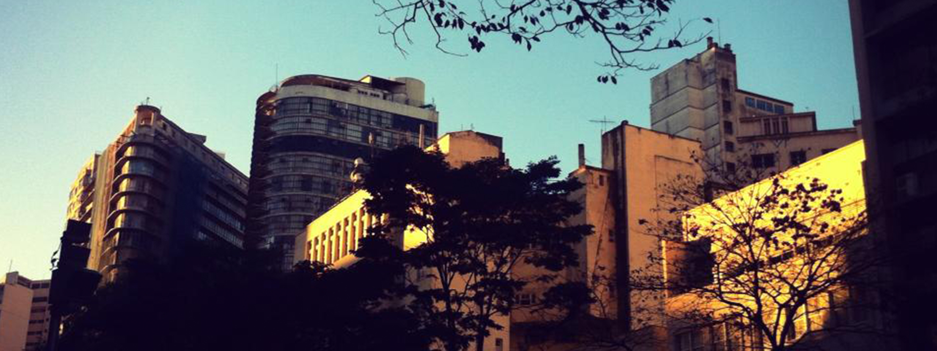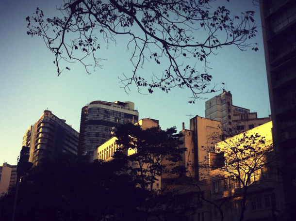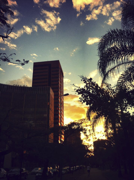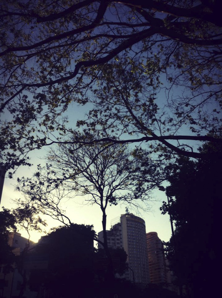 Na cidade, o céu é visto sempre através de uma moldura. Seja a moldura dos edifícios que cercam a rua, seja a moldura vegetal das copas das árvores. Há sempre um arredor na imensidão do firmamento. É como um quadro que pode ser apreciado em qualquer local da rua. O céu pinta seus tons ao longo do dia. O amanhecer e o entardecer colorem os edifícios, derramam sua luz na calçada, no topo das árvores e formam os seus diversos dégradés.