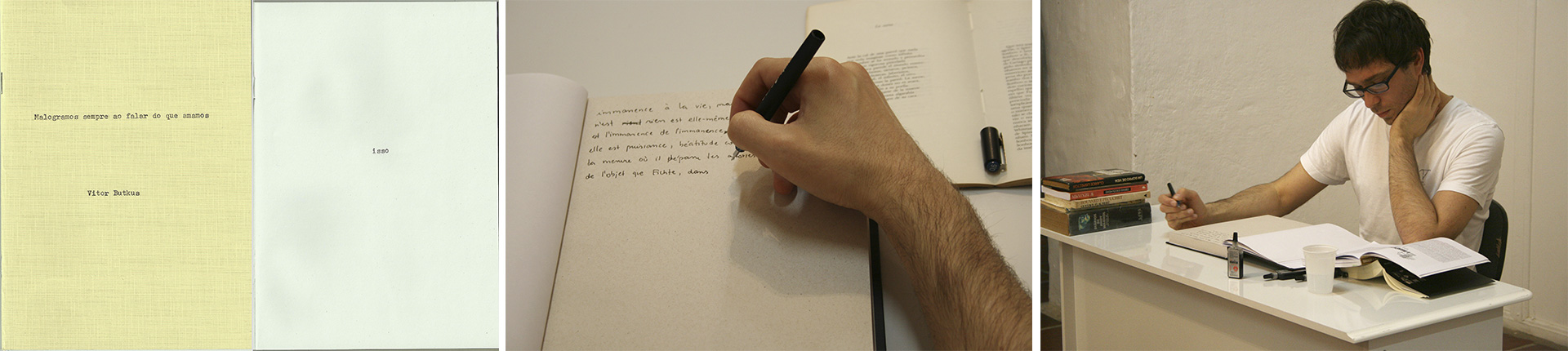 Quando Butkus trabalha a partir da obra de outros autores, como nesse caso ou nos vídeos relacionados ao artista Rafael França, realizados em ocasião de sua dissertação de mestrado “Libro negro: respostas a Rafael França” (2013)5 , há inicialmente um mergulho profundo no que cada um pensava e produzia (BUTKUS, 2015), resultando em uma espécie de paixão entre o artista/pesquisador e essas vidas criadoras. Assim, “Malogramos” é costurado através do seu círculo de afetos, dos autores que ama, guardados em sua biblioteca, estando nele presente “a dimensão de uma fragilidade humana (amar), justaposta a uma outra fragilidade (morrer)” (BUTKUS, 2015). E ao lançar-se nesse arquivo de últimos textos, sejam eles inacabados ou não, e os colocar no tempo presente, inter-relacionando-os em uma justaposição inesperada, Butkus atua com a única ferramenta que encontramos para permanecer: a do criar.