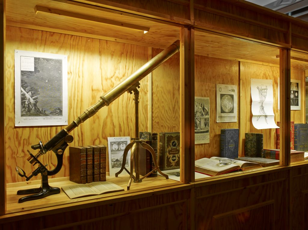 Pelo vidro do gabinete, pode-se ver uma edição de Discurso Sobre o Método, de René Descartes, impresso pela Biblioteca de Ciências Religiosas, em 1637, exibida junto a gravuras da escada de Jacob recriadas por diversos artistas ao longo da história. A justaposição de objetos de categorias variadas continua com o retrato do filósofo francês ao lado de uma foto de um homem negro, enquanto o livro sobre ciência islâmica escrito em francês é visto próximo a manuscritos em árabe. A capa de uma revista sobre o eclipse solar próxima a um microscópio e um telescópio acoplados, como se fossem um único instrumento, reforça a predominância do tema científico, embora outros assuntos também tenham lugar nessa miscelânea.