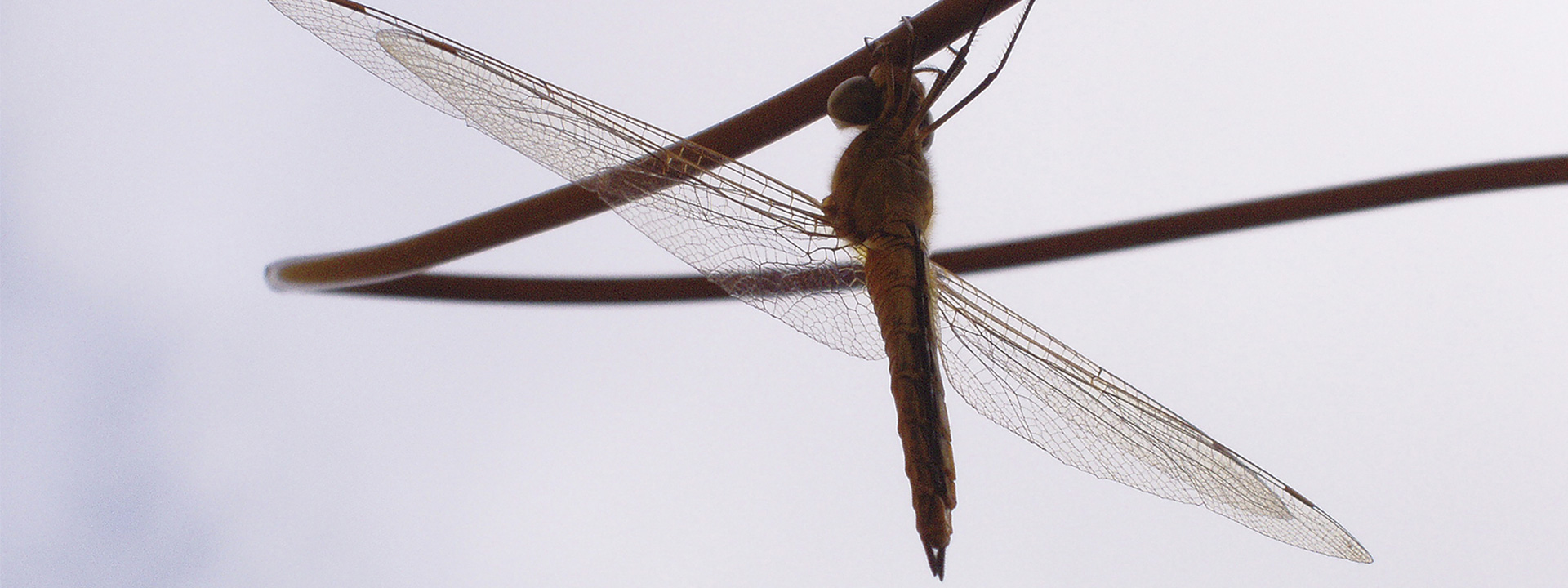 Quando as libélulas voavam ao redor da escultura, procurei observá-las e, às vezes, encontrei asas de libélulas mortas, que já fazem parte de uma coleção com intuitos artísticos. Também produzi dois vídeos com libélulas que encontrei no mesmo local. No vídeo “Morse”, uma câmera parada capta uma libélula quase imóvel, que está prestes a morrer. O olhar aparentemente neutro e distante da câmera, que remete aos filmes de documentação científica, é contraposto ao fato sensível de que a libélula está prestes a morrer e que se movimenta como se quisesse se comunicar através de um código Morse com o observador. A cena é bastante lenta, quase uma fotografia. Ao mesmo tempo que observamos os movimentos da libélula e suas semelhanças com alguém que tecla um código Morse, vemos também o esvair da vida da libélula. A aparente ironia, que é sugerida pelo título, é posteriormente desfeita quando percebemos que o filme documenta os últimos minutos de vida do animal. O trabalho procura oferecer uma reflexão sobre a efemeridade da vida, o isolamento e as dificuldades de comunicação, quer seja entre o homem e a natureza, quer seja entre o homem e seus semelhantes.