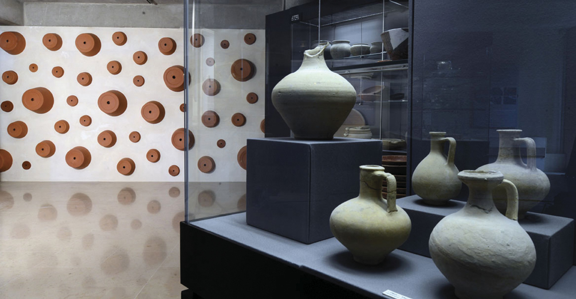 Em frente a estas faces da parede, tanto a de trás como a frontal, a cerâmica pré-histórica se apresenta em pratos, jarros, ânforas, em diversos tamanhos e de diversos períodos. A parede de Duprat funciona como um reflexo de tempos, onde as ânforas olham os vasos industriais colocados como que a decorar uma parede.