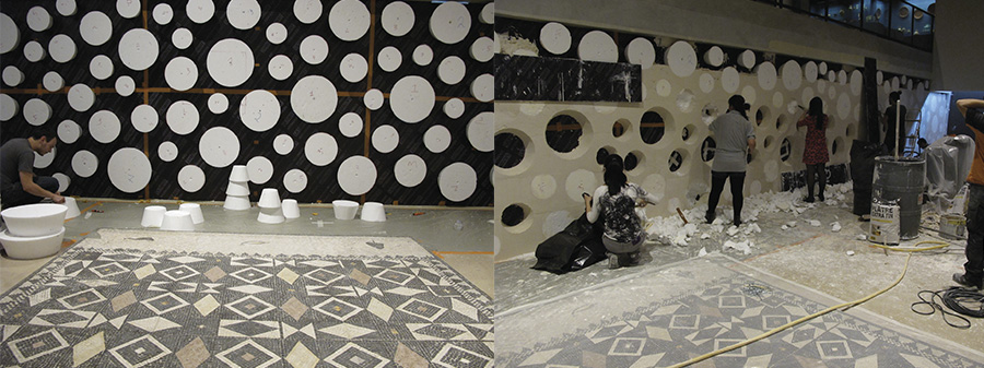 Após este primeiro momento, o espaço em volta dos moldes foi preenchido com o gesso, formando finalmente a parede. Uma vez seco o gesso, os assistentes do artista deram início à retirada do isopor, recortando e limpando os buracos remanescentes. Depois, foram encaixados os vasos de maior diâmetro destinados a cada um dos buracos, estando estes vasos protegidos por um papel a fim de não serem manchados com o gesso. O próximo passo era preencher os espaços ao redor dos vasos e aplainar o gesso da parede.