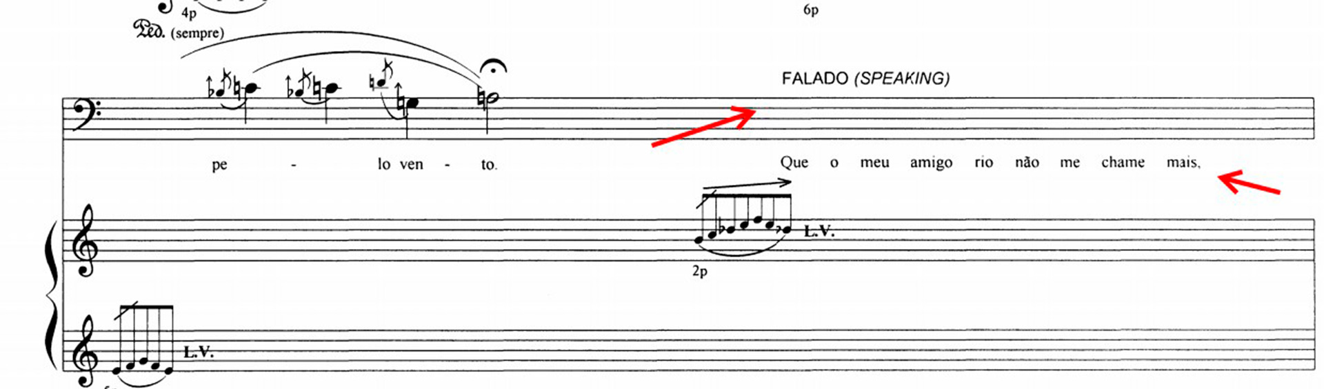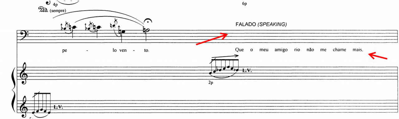 Destaca-se aqui um trecho em que o compositor pede que o texto seja falado aos invés de cantado, outro recurso valorizado nas peças vocais na contemporaneidade desde o Sprechgesang de Shoenberg.