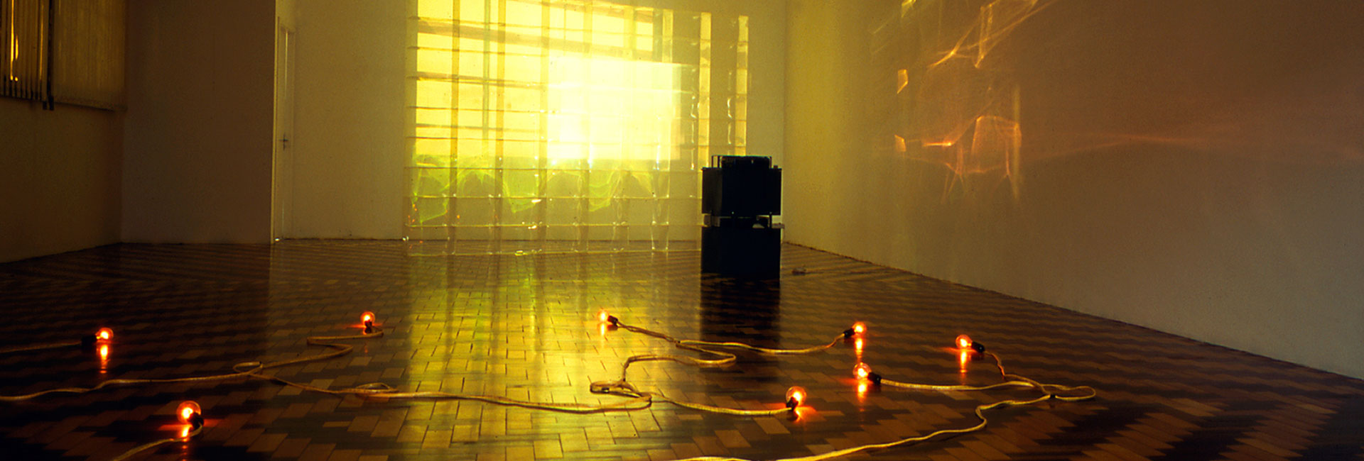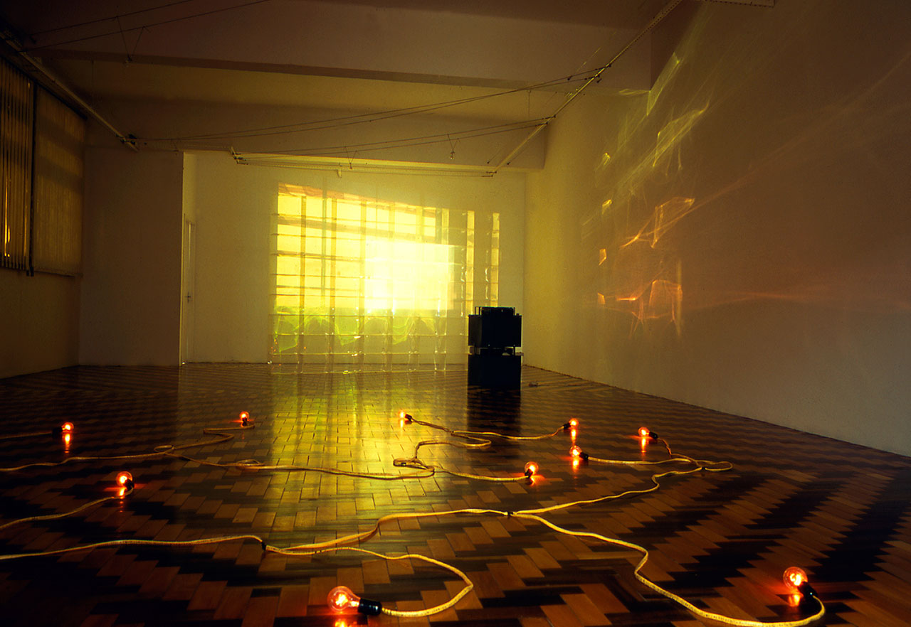 O trabalho Hipocampo2 utiliza fios de luz ligados à rede elétrica nos quais, ao longo de sua extensão, um texto se inscreve. Hipocampo (figura 1) deve ser exposto diretamente no chão, utilizando um plano horizontal,3 sugerindo que o trabalho seja visto ao caminhar sobre ele, entre seus fios. Cada ponta de fio, um total de doze, tem uma lâmpada incandescente. Essas lâmpadas, em dois grupos de seis, estão ligadas a duas fontes com temporizadores que fazem com que sua luz pulse de forma ritmada. O ritmo em que a luz é emitida pelas lâmpadas faz uma alusão à nossa própria pulsação: o dilatar-se e contrair-se do sistema circulatório, em um ritmo mais forte ou mais fraco, de acordo com nosso estado. Esse ritmo é mais acelerado ao estarmos despertos ou mais relaxado ao estarmos propícios ao sono. Muitas vezes, nos momentos de relaxamento anteriores ao cairmos no sono, nosso pensamento é invadido por lembranças que passam a nos perturbar e a partir das quais estabelecemos um monólogo interior. Despertos, nossa pulsação se acelera até que se restabeleça um ritmo possível para o sono e para o sonho, em uma alteração de espaços de tempo entre uma pulsação e outra que se afastam, possibilitando um ritmo mais lento quando estamos tranquilos.