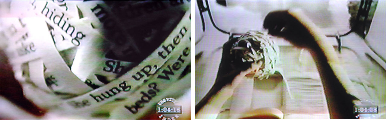 Tanto em Lineament, de Ann Hamilton, quanto em Hipocampo, os textos, ao serem lidos, são indissociáveis de sua forma. Neles, “a superposição dos modos discursivos e formais chega ao ponto onde o intercâmbio de um ao outro oferece a possibilidade de um processo de significação justificado, e que não é sem dúvida o fim da história de suas combinações.” (DOMINO, 1989, p. 67, tradução da autora).9