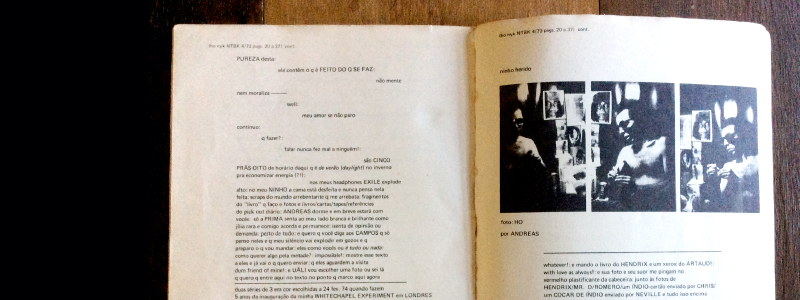 Este é um ponto que merece alguma atenção. Ao retomar o diálogo entre literatura e artes visuais, as revistas questionam os limites historicamente estabelecidos entre estas disciplinas. Hélio Oiticica envia para a revista Polem uma longa carta ilustrada, José Paulo Paes envia para Através uma fotografia/ready-made. Definir estas contribuições como literária e ou visual é mal compreendê-las. Significa congelar categorias que, como assevera Benjamin, são essencialmente históricas.