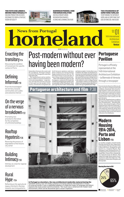 Entretanto, o cenário ganha outros contornos em março de 2014, há pouco menos de três meses da abertura da exposição. Anunciou-se que a representação não iria seguir os modelos realizados anteriormente, quando ocupava determinado espaço físico cedido pela Bienal:1 naquele ano, optou-se por transformar o Pavilhão Português em um jornal, batizado de Homeland: News from Portugal.