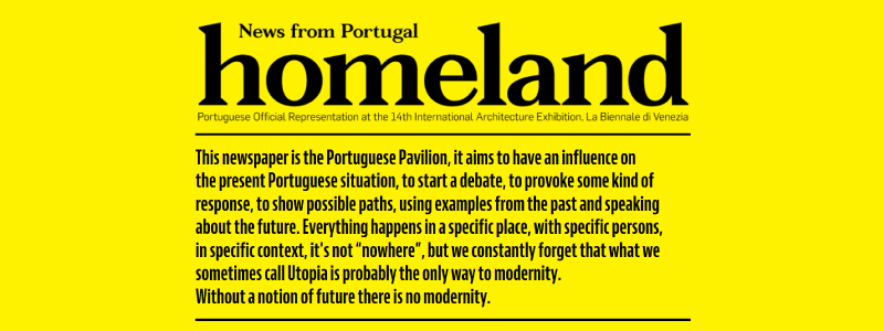 Com o projeto Homeland: News from Portugal, pretende-se abrir uma discussão para os desafios que a disciplina enfrenta, especialmente perante o momento econômico crítico vivido no país, e reivindica-se uma posição mais aberta e ativa por parte dos profissionais da área, sugerindo a criação de novas relações entre o arquiteto e a sociedade contemporânea. Desse maneira, além de possibilitar novos modos de praticar arquitetura, abre-se caminho para pensarmos, também, em outras maneiras de expô-la.