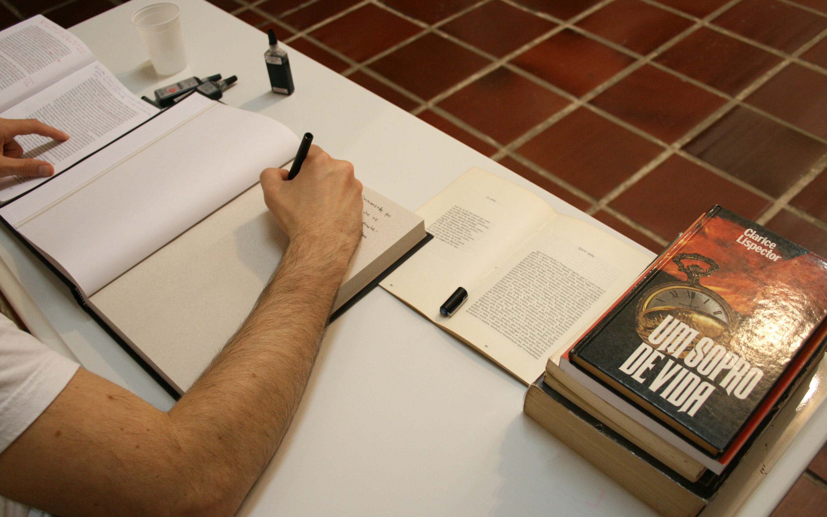 Além dessas “interrupções”, a execução da performance esteve sujeita a mais duas “limitações”: eu iria realizar esse ato durante as 10 horas que me haviam dado como limite e ela terminaria quando o caderno fosse totalmente preenchido. De fato eu estive sentado junto àqueles livros por 10 horas. E o caderno ainda não foi totalmente preenchido (a performance continuou no ano seguinte, na cidade de Vitória). Ou seja, ainda não está terminado, mas considero que já existe como trabalho, como proposição, como ato.