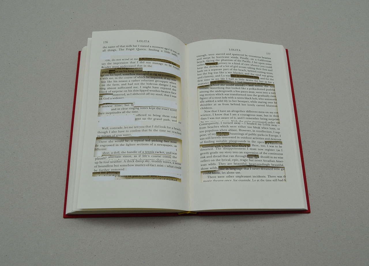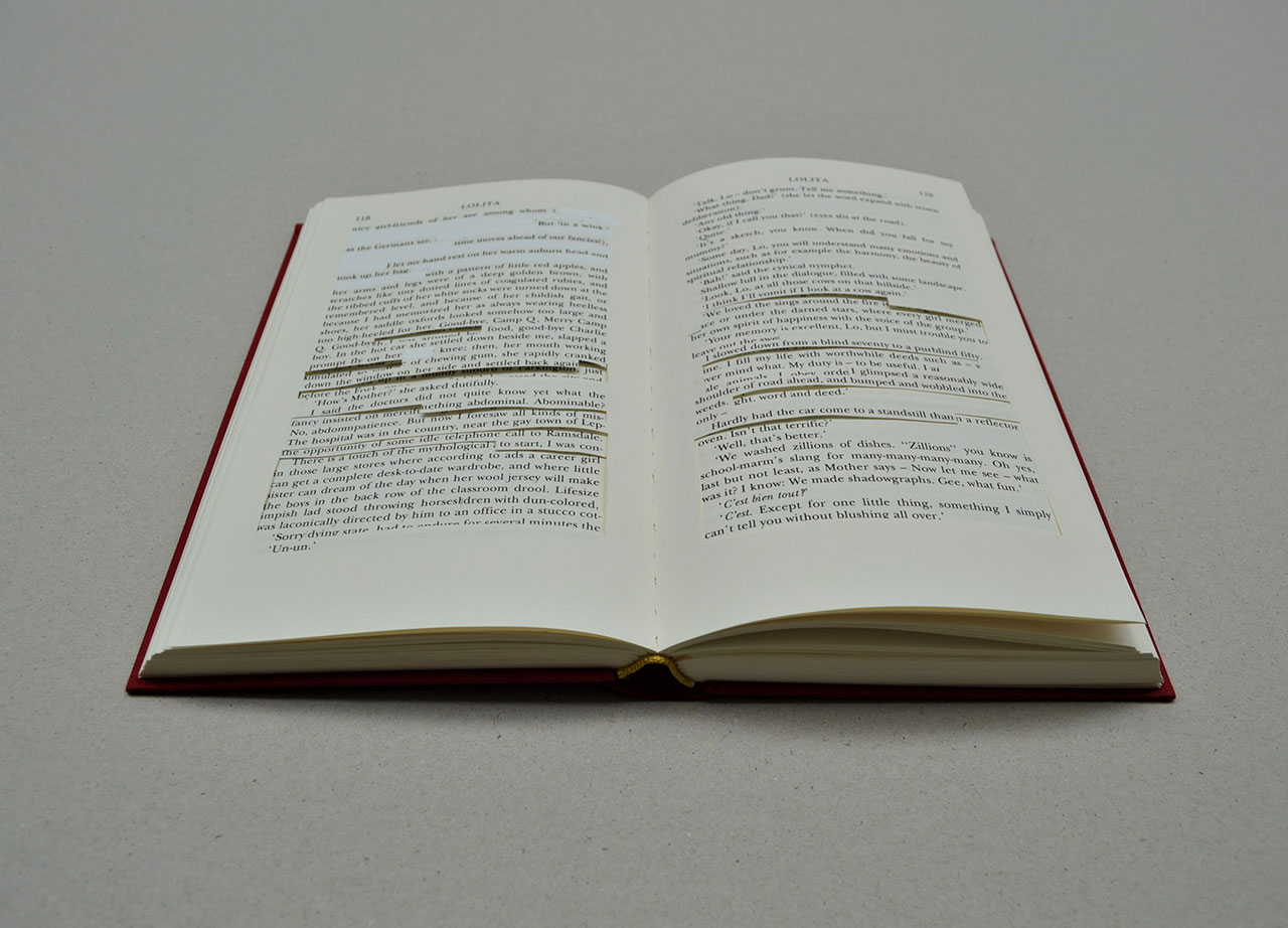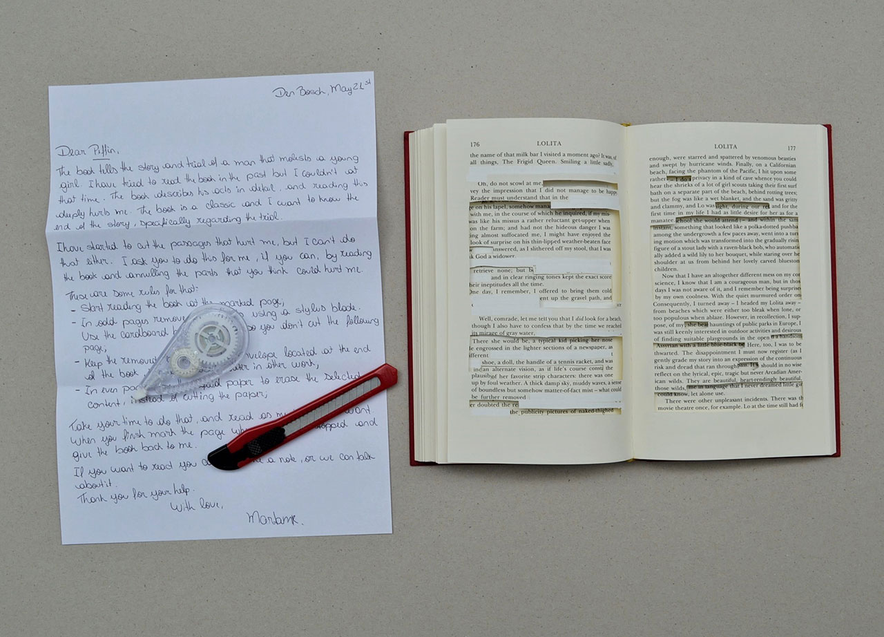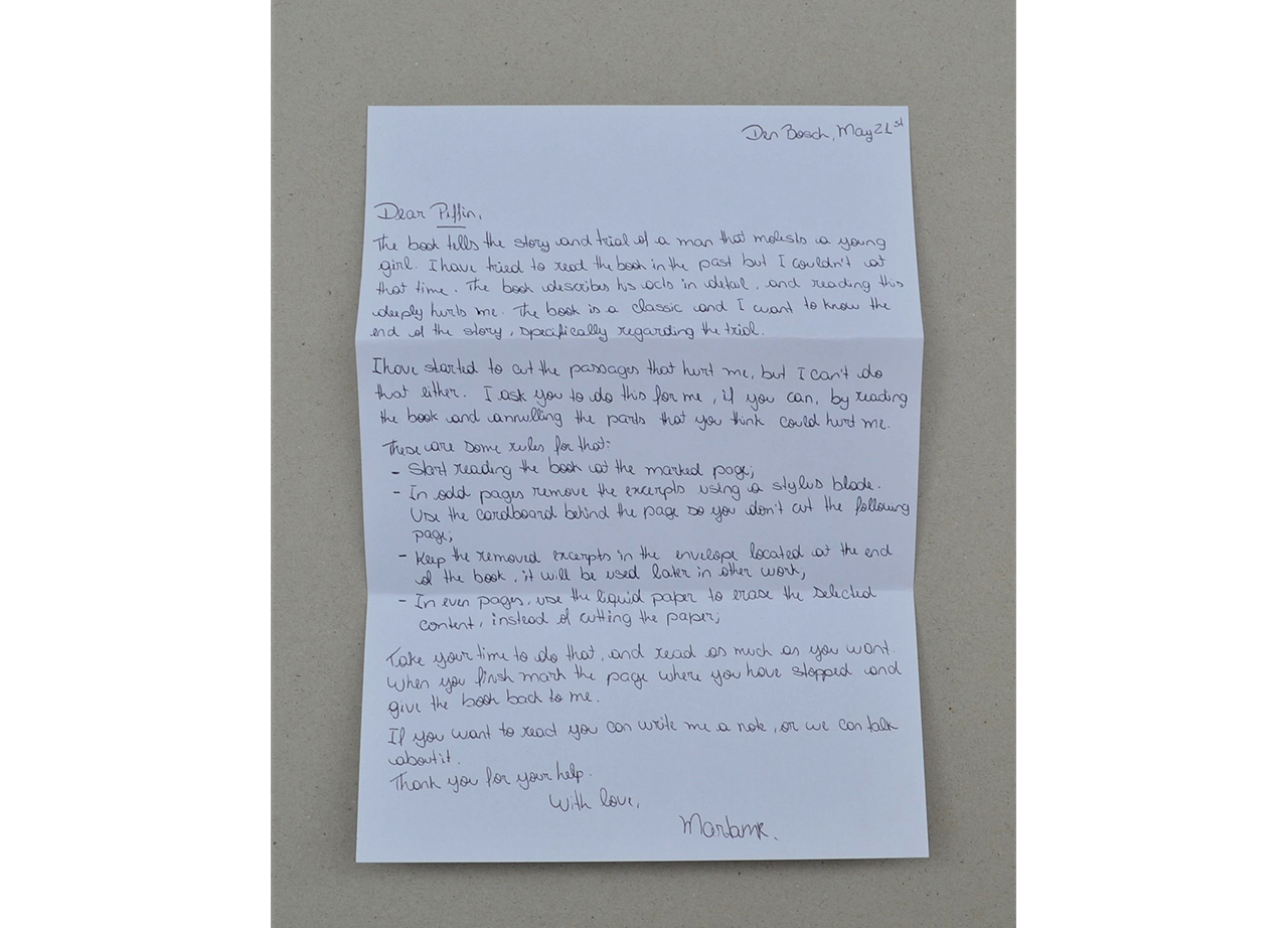 In “Reading Lolita for me”, 2015–2016, Masiero asked the participants to cut out the parts of the book she said were too hard for her to process. In line of the books’ familiarity the reasons behind this request are imaginable, they are approachable. The artist here asks her audience to get involved in issues related to her own subjectivity and history. What is produced in between though is a strange object. What is left is a book presented with the traces of this reduction. It is a non-space, a non-interaction: nothing is exchanged other than a prevention of. The cut-out parts of the book are a negative space. It is an omission that is produced, a lack. It is the presentation itself, a trace of what has passed between artist, participant and object. The artist speaks about her work in terms of healing. Now, how to understand and perceive such a notion? How can an omission heal?