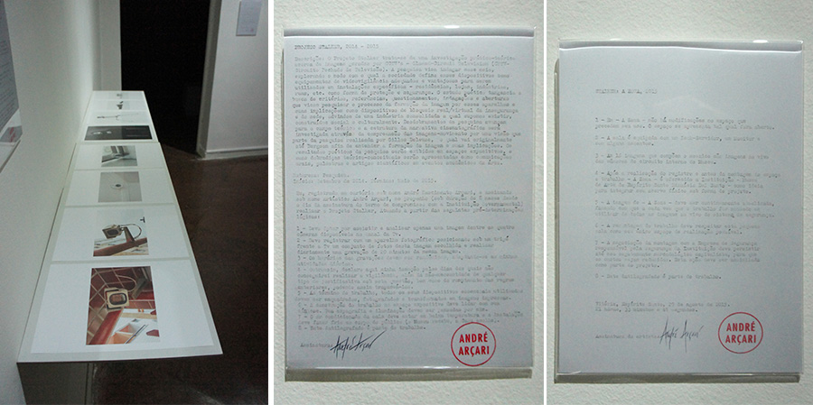 Por essas e outras questões mais amplas de um projeto de mundo contemporâneo, o trabalho, que intitulamos Stalker, se prestou a ser apresentado dentro de uma sala expositiva do museu – o qual, por sua vez, continha uma segunda sala menor, usualmente fechada pela instituição que recebeu o projeto. Dentro da grande sala expositiva foi exibido o trabalho tautológico de título Projeto Stalker, e, através de um acordo com os responsáveis pela pintura e serviços de ordem apriorísticos, foi realizada a instalação do trabalho no espaço. Obtivemos aprovação (junto à equipe do Museu) para abrirmos a pequena sala, que, por sua vez, recebeu como título A Zona, em conformidade com um poder crítico do espaço e de um lugar homônimo dentro do filme Stalker (1979) do cineasta russo Andrei Tarkovski, um dos pilares fundadores da pesquisa em questão. Se de um lado, o acesso público à sala menor permitia um abrir da instituição para os próprios fruidores, esses mesmos partícipes tiveram acesso às imagens do circuito interno do museu (imagens ao vivo), ou seja, eles puderam adentrar um vértice dessa mesma Instituição-Arte, cujos subsídios advêm do Estado, um espaço governamental gerido pelo poder público, e consequentemente por dinheiro arrecadado pelos impostos pagos pelos cidadãos do próprio Estado. Essa pequena sala continha imagens ao vivo das câmeras de segurança da instituição, como já citado, e eram exibidas como um mosaico em um monitor de LED. A saber, esse trabalho apresentava a cartografia do museu, como apontou Júlio Martins no texto curatorial da mostra, exibindo assim um índice do espaço físico (real) da instituição, onde era possível ter acesso a lugares nunca antes visitados pelo público em geral, como (1) a reserva técnica; (2) a sala da administração/diretoria; (3) corredores internos de acesso a esses mesmos espaços; bem como (4) as próprias salas expositivas, além de outros ambientes, como (5) as ruas (entorno) – que podem ser assimiladas como o externo da Instituição-Arte (validadora) – em que se encontram o próprio museu. Conteve então, dentro da sala principal, poucos elementos, e isso se deu, principalmente, para que fosse ressaltado uma síntese da pesquisa. A grande TV de LED instalada sob uma escultura com duas hastes de alumínio presas ao teto, apresentava um vídeo em looping com corte aproximado de 30 minutos, em que eram exibidas imagens captadas de uma câmera filmadora por uma TV, dentro do apartamento do artista, mostrando registros de imagens das câmeras de segurança do seu lugar-habitação. Essa extensão do tempo e a forma de exibição do trabalho, apenas por cortes secos (técnica de edição de vídeos/filmes) que formavam um continuum de linearidade temporal do estudo, apresentavam as imagens desprovidas de uma narrativa tradicional de cinema, apesar de conterem em essência a noção de uma imagem-movimento, pondo em prática estudos de uma teoria dessa mesma imagem elaborada por Gilles Deleuze (1985) em suas investigações sobre o fazer cinematográfico, analisadas durante a pesquisa. As placas acrílicas expositivas ressaltavam o caráter discursivo da pesquisa, pondo-a como estudo prático-teórico. Acerca dos acrílicos, sua estética inseria o texto numa condição de documento, parte integrante do todo da pesquisa, que se exibia ali fragmentária, amalgamada por aqueles elementos presentificados espacialmente. Toda a constituição da instalação, então, se oporia a uma fundamentação aurática de obra única, ao exibir seu processo e seus conjuntos de regras internos, concebidos pelo próprio artista como engrenagens que, instaladas como peças da máquina (o próprio trabalho em si), a permitiriam então se mover. Em termos gerais, o trabalho obteve êxito por explorar fragmentos desse campo, e por sua concepção múltipla ao se valer de meios como o próprio uso funcional e poético da linguagem, assim como a exploração da imagem-estática, imagem-movimento, som, discurso, instituição, arte, estética, política, cultura e identidade.