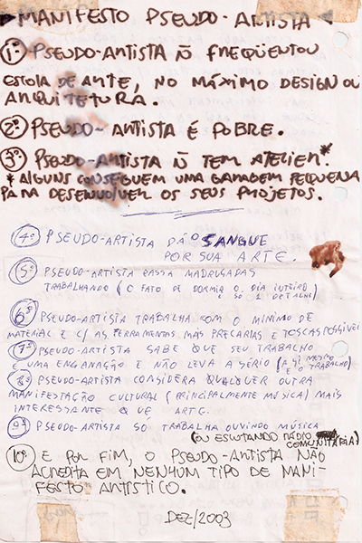 Ao final do mesmo ano, já havia sido enumerada uma série de características do que foi por eles chamado de “pseudoartista”, isto é, um personagem (cujos aspectos peculiares são expressos por um irreverente manifesto) criado pelos fundadores do grupo. O pseudoartista seria, na concepção do grupo, um indivíduo que mesmo tendo uma produção, um pensamento, e um foco, definidos na sua obra, questiona paulatinamente o seu “status” como artista. Ou seja, o pseudoartista questiona a sua visualidade real e existência social, o seu papel frente às instituições de arte e às mídias de massa; e a validade de seu percurso e obra inseridos nesse cenário de preceitos diversos e divergentes que caracterizam a arte contemporânea.
